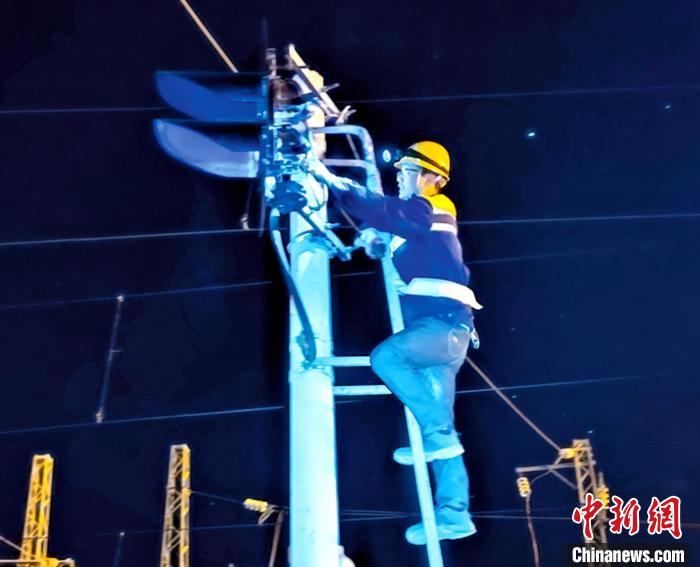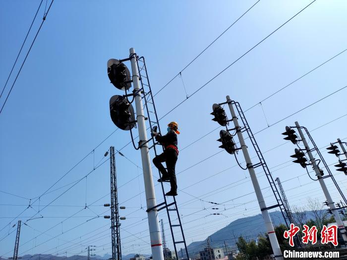 圖為安康東電務(wù)車間職工正在進(jìn)行高柱信號機(jī)檢修。王建滆攝