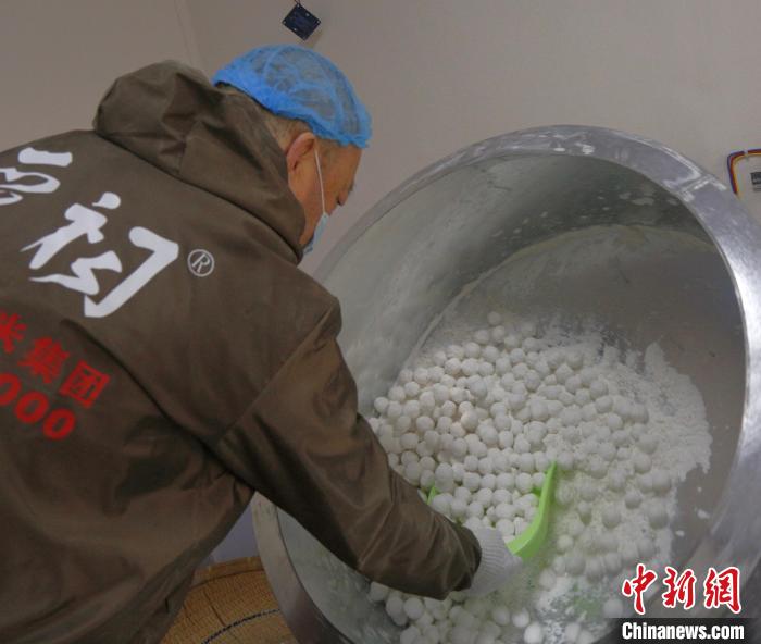 7臺電動滾筒轟鳴作響,圓滾滾的元宵伴著江米粉一起飛舞——蘸一遍水滾一次,一顆正方體的餡料要經過六蘸六滾,方可形成瓷實的圓球形。如此滾制出的元宵,無論煮或者炸,都軟糯香甜、口感獨特,不少老太原人要的就是這一口“老味道”。
