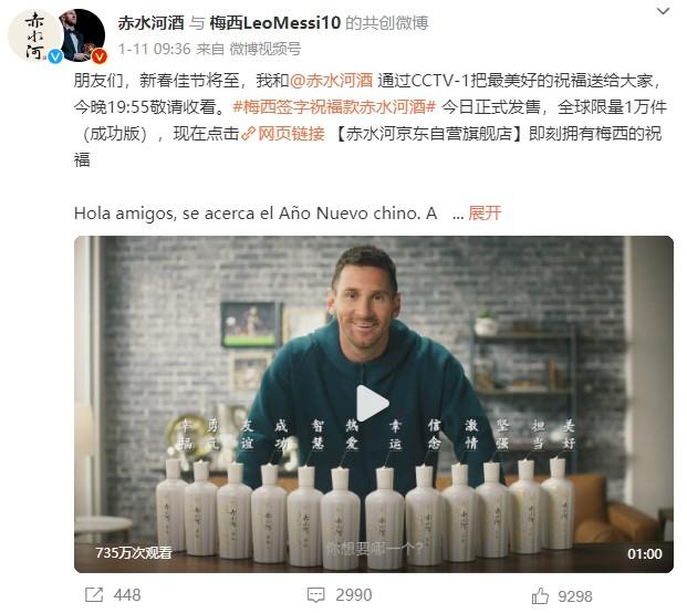 1月11日,梅西發(fā)博官宣牽手赤水河酒。梅西個人微博發(fā)文稱,梅西簽字祝??畛嗨泳飘?dāng)日正式發(fā)售,全球限量1萬件,并配上了一段梅西為酒瓶一一簽名的宣傳視頻。