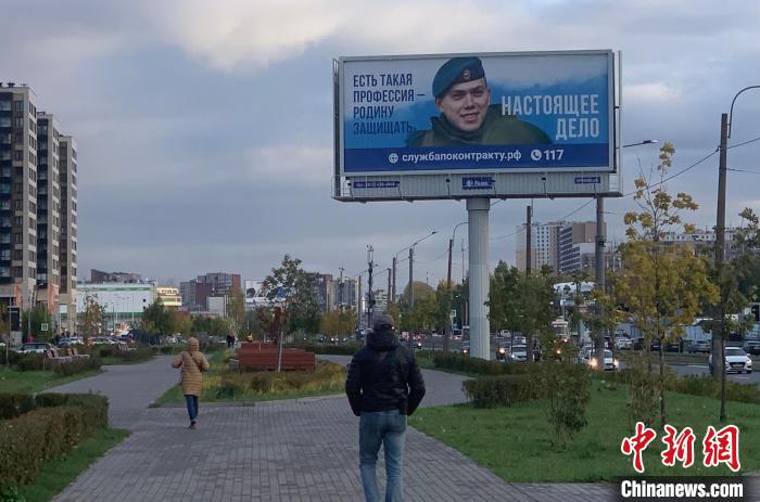 2023年10月,俄羅斯圣彼得堡街道上的征兵海報。 中新社記者 商永 攝