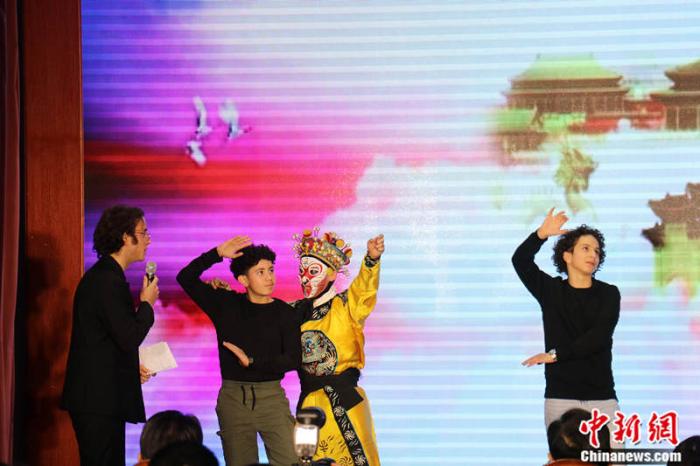 戲曲名段表演、法語經(jīng)典歌曲串燒……你方唱罷我登場(chǎng),中法青年在文藝表演中秀出各自的文化風(fēng)采。由中國(guó)戲曲學(xué)院學(xué)生代表帶來的民族器樂演奏、經(jīng)典戲曲名段聯(lián)唱獲得了臺(tái)下的陣陣喝彩。在京劇片段《大鬧天宮》表演結(jié)束后,法國(guó)少年受邀與孫悟空扮演者互動(dòng)。
