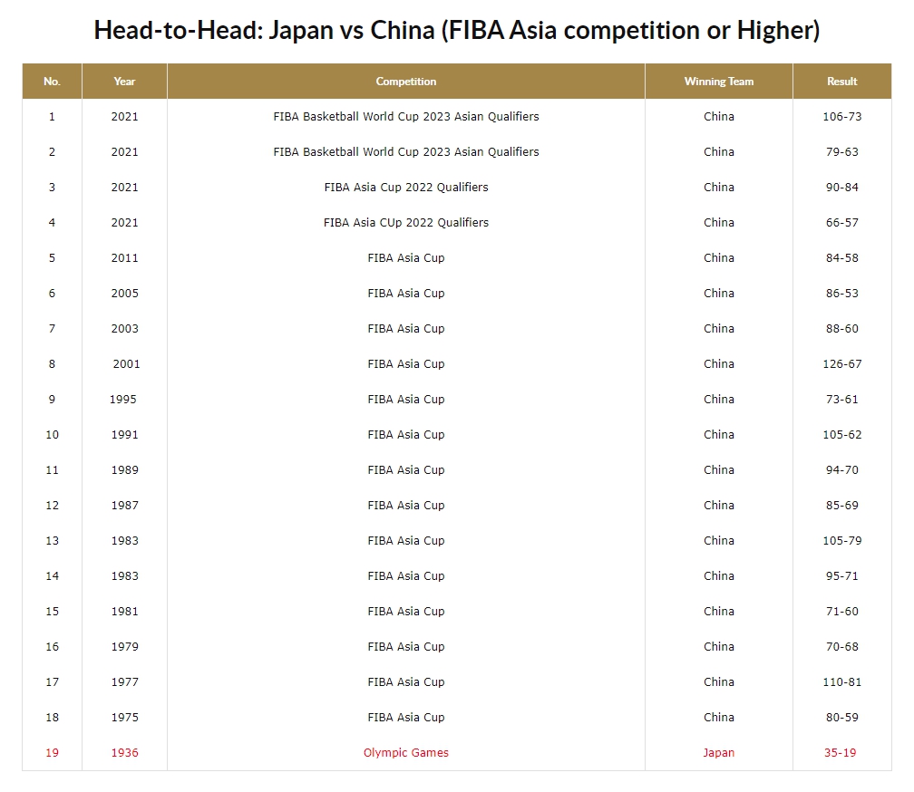 據(jù)國(guó)際籃聯(lián)統(tǒng)計(jì),自1936年奧運(yùn)會(huì)以來,中國(guó)男籃從未在FIBA國(guó)際籃聯(lián)舉辦的亞洲杯及更高級(jí)別比賽中負(fù)于日本男籃。