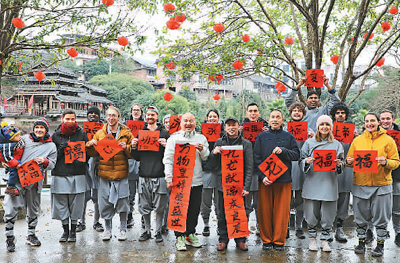 春節(jié)期間,廣西壯族自治區(qū)桂林市靈川縣九屋鎮(zhèn)西嶺山莊迎來一批外國客人,他們一起寫福字、磨豆腐、舂糍粑、釀圓子……沉浸式體驗(yàn)中國傳統(tǒng)民俗,現(xiàn)場歡聲笑語不斷。