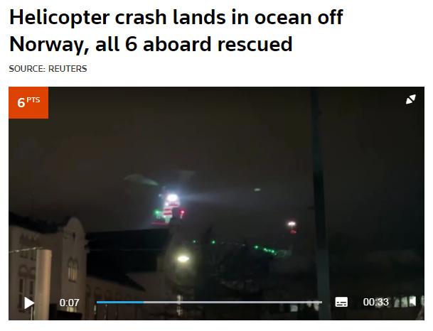 中新網(wǎng)2月29日電 據(jù)路透社報道,當(dāng)?shù)貢r間28日,挪威聯(lián)合救援協(xié)調(diào)中心稱,一架載有6人的直升機(jī)在挪威西部海岸附近海域墜毀,機(jī)上所有人員隨后被從海中救起。