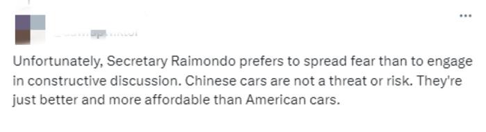 一名外國(guó)網(wǎng)友表示,雷蒙多喜歡“散布恐懼,而非進(jìn)行建設(shè)性的討論”,而“中國(guó)制造的汽車比美國(guó)汽車更好、更便宜”。