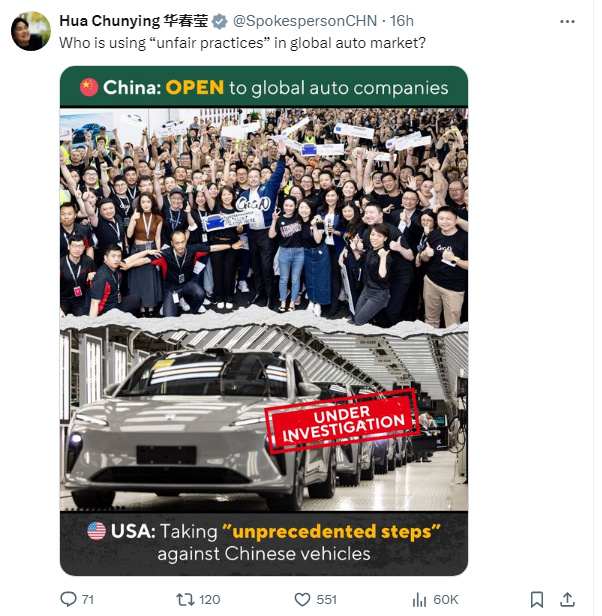 華春瑩還發(fā)布了一張圖,標(biāo)明中國(guó)和美國(guó)在汽車領(lǐng)域的做法并寫道,“是誰(shuí)在全球汽車市場(chǎng)采取‘不公平的做法’?”