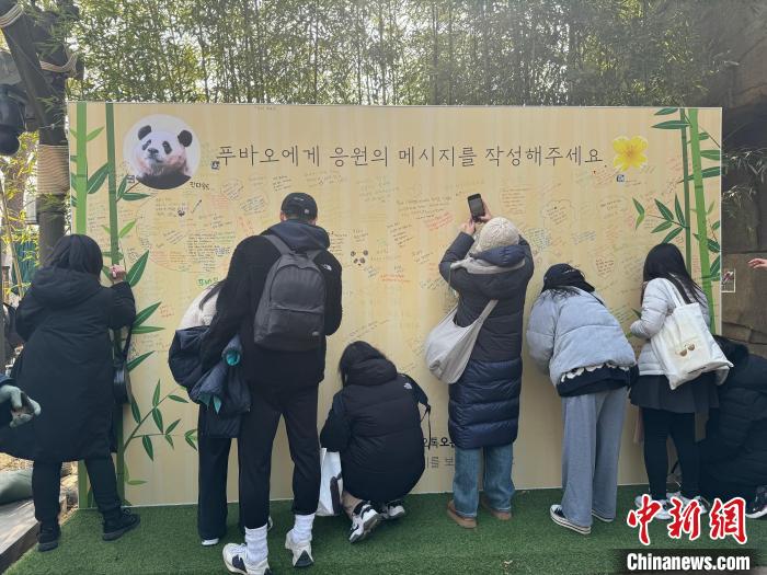熊貓世界外設(shè)有一塊大型留言板供游客留言。記者看到板上有用圓珠筆畫的大熊貓形象,還有用韓語寫的留言:“福寶,有你真好!”“希望我家孩子幸福,永遠(yuǎn)健康!”“我愛你福寶,祝你永遠(yuǎn)幸福!”