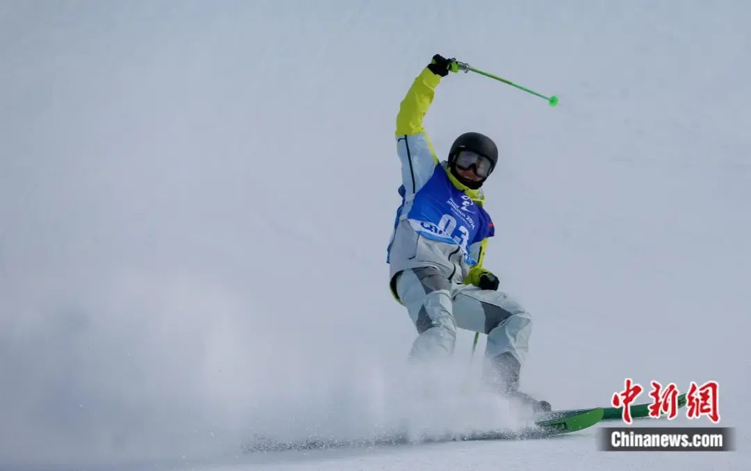 “十四冬 ”自由式滑雪空中技巧公開組女子個(gè)人比賽中,徐夢(mèng)桃在空中翻飛。 韓冷 攝