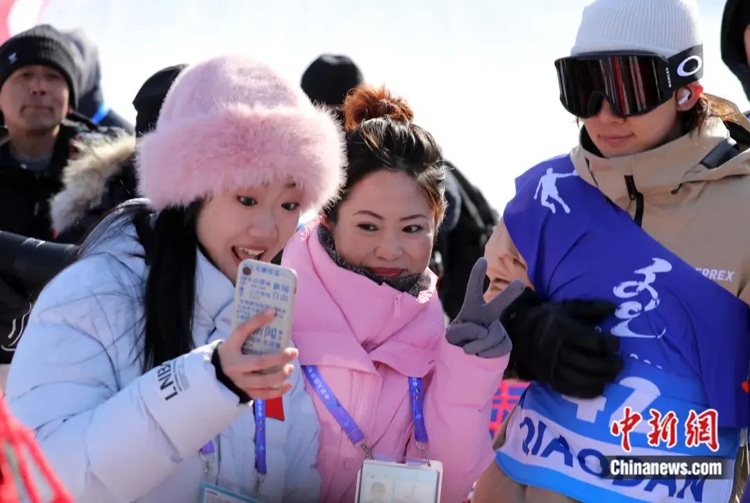 “十四冬”單板滑雪大跳臺(tái)公開組男子決賽現(xiàn)場(chǎng),觀眾找比完賽的蘇翊鳴(右一)合影。 韓冷 攝