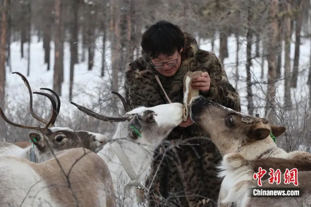 在中國(guó)最后一支使鹿部落里,馴鹿貪婪地吃著使鹿鄂溫克人覺(jué)樂(lè)手里的豆餅。 王鄭胤 攝