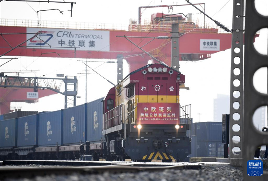 3月7日,中歐班列(越南·河內(nèi)——中國·西安——匈牙利·布達(dá)佩斯)跨境公鐵聯(lián)運(yùn)班列從西安國際港站駛出。新華社記者 李一博 攝