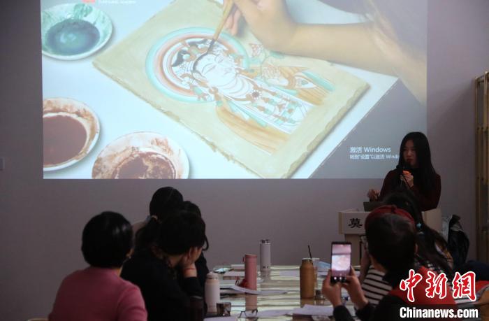 2023年2月,在敦煌研究院莫高學堂,研學導師給學員講授敦煌壁畫臨摹技法?! 垥粤?攝