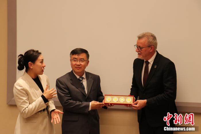 中國社會(huì)科學(xué)院領(lǐng)導(dǎo)與巴西坎皮納斯州立大學(xué)校長互換禮物。 中新網(wǎng)黃方 攝