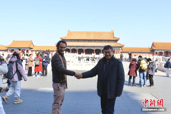 巴西坎皮納斯州立大學(xué)孔子學(xué)院中方院長高沁翔教授與孔子學(xué)院巴方院長布魯諾·孔蒂(Bruno Martarello de Conti)在故宮握手合影。 中新網(wǎng)黃方 攝