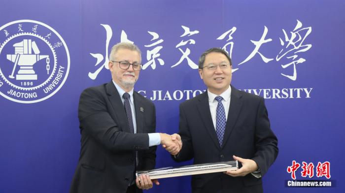 北京交通大學(xué)校長余祖俊和巴西坎皮納斯州立大學(xué)校長安東尼奧·梅雷萊斯(Antonio José de Almeida Meirelles)互贈(zèng)禮物。 中新網(wǎng)吳家駒 攝