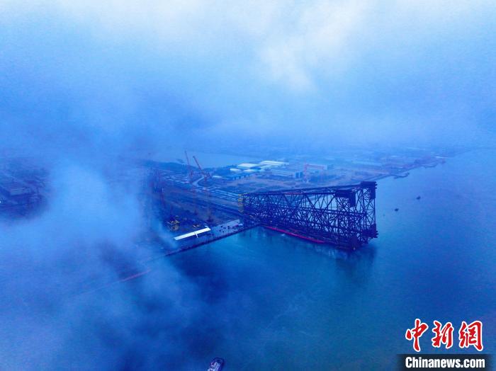 3月12日,亞洲第一深水導(dǎo)管架“海基二號”在廣東珠海建造完工。這是“?;枴睂?dǎo)管架裝船后全景。(中國海油供圖)
