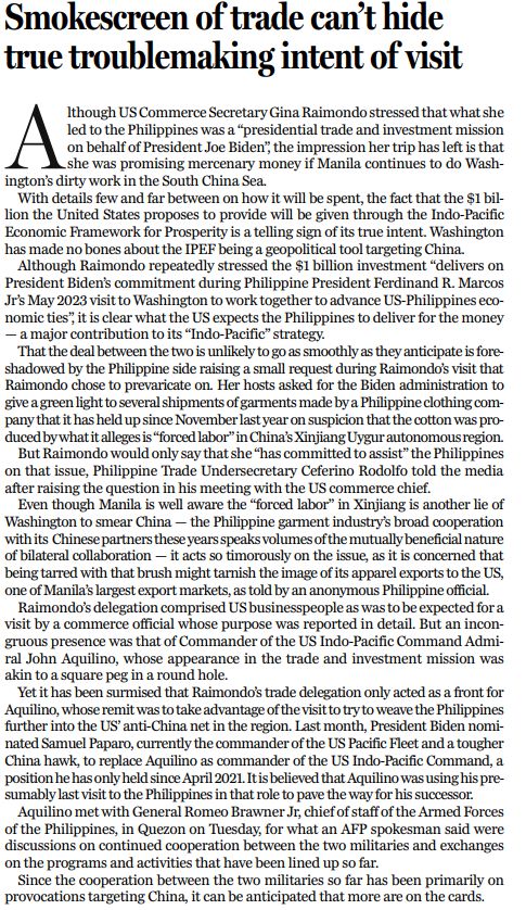 雷蒙多強(qiáng)調(diào),向菲律賓投資的10億美元 “是履行拜登總統(tǒng)于2023年5月訪菲期間與菲總統(tǒng)馬科斯的承諾,加強(qiáng)兩國經(jīng)濟(jì)聯(lián)系”,但提議這10億美元經(jīng)由印太經(jīng)濟(jì)框架提供,相關(guān)支出細(xì)節(jié)雖尚未披露,但也顯示出美國政府的真正意圖:將印太經(jīng)濟(jì)框架變成針對(duì)中國的地緣政治工具。