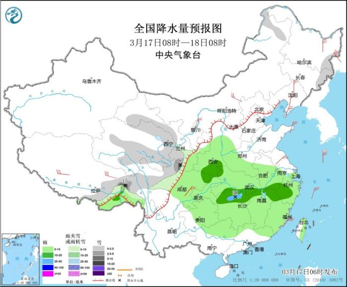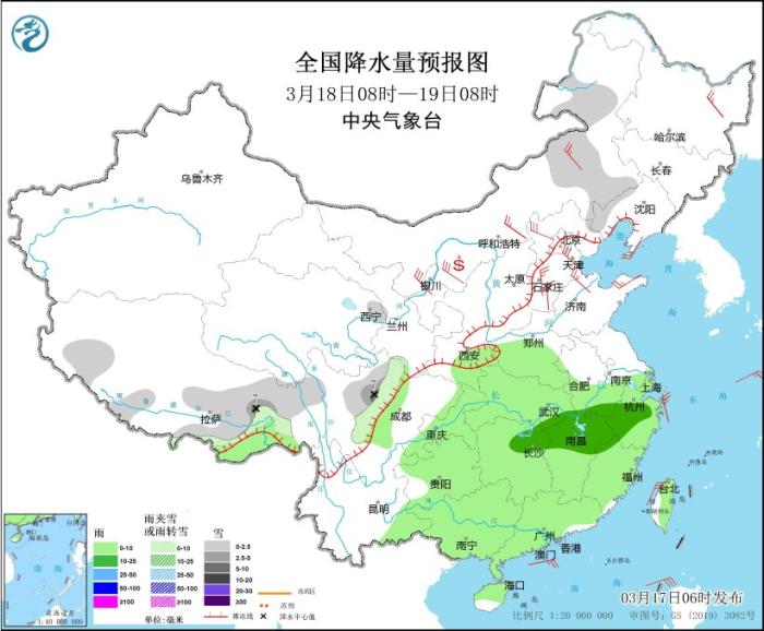 3月17日08時至18日08時,西藏東部、青海東北部和南部、甘肅南部、川西高原北部、內(nèi)蒙古東北部、黑龍江東部、吉林東部等地部分地區(qū)有小到中雪或雨夾雪,其中,西藏東部、川西高原北部等地局部地區(qū)有大到暴雪(10~15毫米)。西藏東南部、西北地區(qū)東部、西南地區(qū)東部、黃淮西部、江淮中西部、江漢、江南、華南北部等地部分地區(qū)有小到中雨,其中,湖南北部等地部分地區(qū)有大雨(25~30毫米)。內(nèi)蒙古中西部、黑龍江東部、遼寧中北部、遼東半島、山東半島、江蘇中部、四川盆地中部等地部分地區(qū)有4~6級風(fēng)。