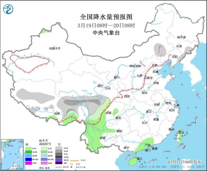 3月19日08時至20日08時,內(nèi)蒙古東南部、吉林東部、西藏北部、青海南部、西南地區(qū)北部等地部分地區(qū)有小雪或雨夾雪,其中,西藏東部和北部、青海南部、川西高原北部等地部分地區(qū)有中雪。西藏東南部、四川盆地西南部、四川南部、云南大部、廣東西南部和中部、海南島、臺灣島大部等地部分地區(qū)有小雨。內(nèi)蒙古東南部和中部、遼寧南部和西部、山東半島等地部分地區(qū)有4~5級風(fēng)。
