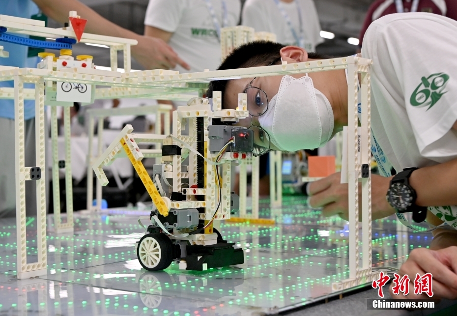 資料圖:一名學生在觀摩自己設計編程的機器人。中新社記者 侯宇 攝