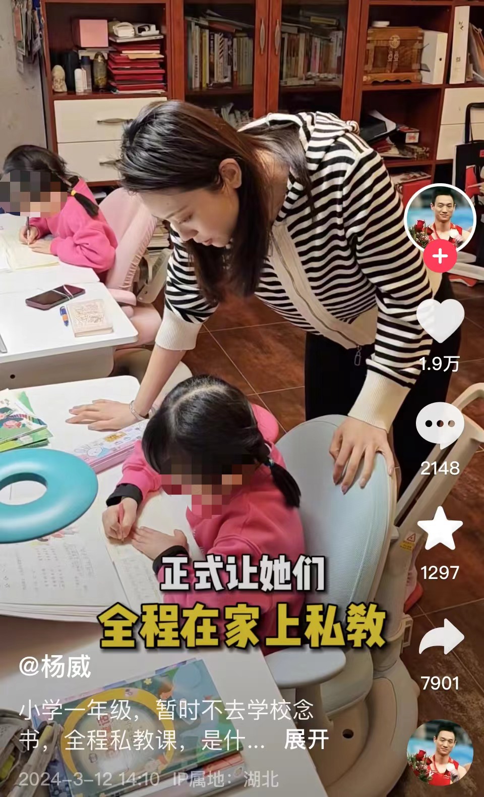 近日,體操奧運(yùn)冠軍楊威在社交平臺(tái)發(fā)布視頻稱,由于去年兩個(gè)女兒連生好幾場病后,他跟妻子楊云做了個(gè)大膽嘗試,讓上一年級(jí)的兩個(gè)女兒暫時(shí)不去學(xué)校念書,全程在家上私教。