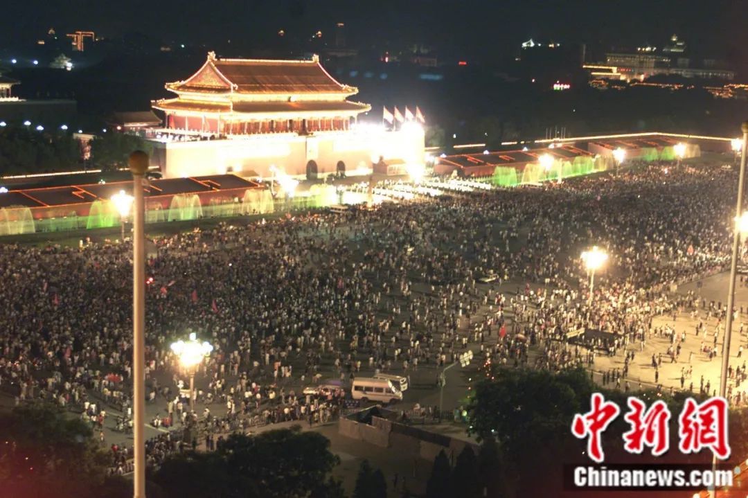 2001年7月13日晚,北京天安門(mén)廣場(chǎng)人潮涌動(dòng),數(shù)以十萬(wàn)計(jì)的民眾徹夜不眠慶祝北京申奧成功。毛建軍 攝