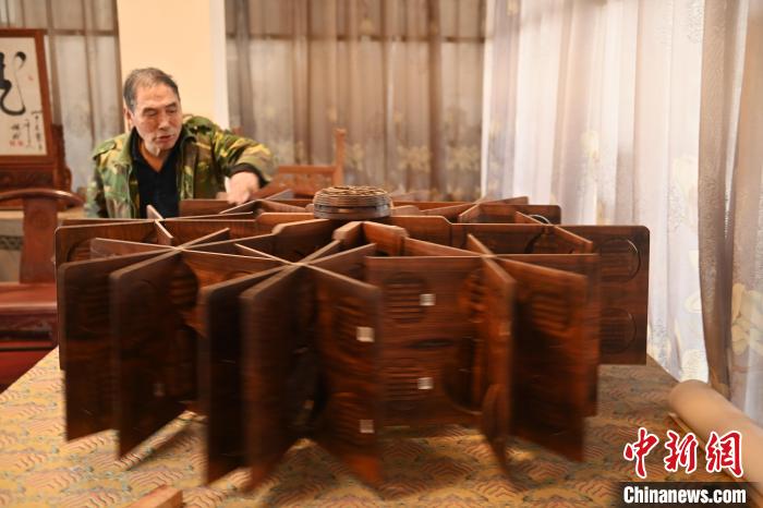 圖為梁寶寶展示畢生心血木雕作品《天地開(kāi)寶照 日月風(fēng)水明》。李亞龍 攝