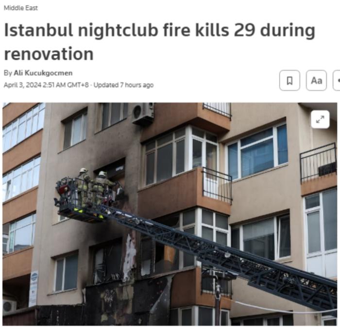 中新網(wǎng)4月3日電 據(jù)路透社報(bào)道,當(dāng)?shù)貢r(shí)間2日,土耳其伊斯坦布爾一家位于多層建筑內(nèi)的夜總會(huì)發(fā)生火災(zāi),造成至少29人遇難。