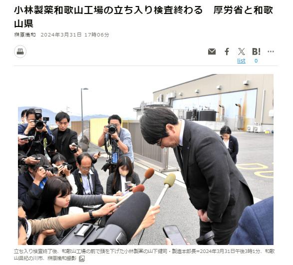 當(dāng)天上午,日本厚生勞動省及和歌山縣政府相關(guān)部門共計17名工作人員,開始對小林制藥公司在和歌山縣的工廠進行檢查。