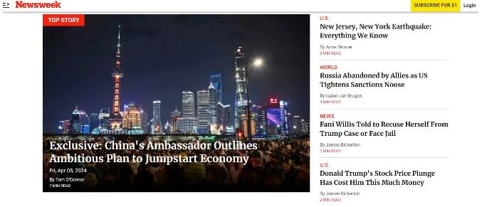 據(jù)中國駐美國大使館網(wǎng)站消息,4月5日,中國駐美國大使謝鋒就“新質(zhì)生產(chǎn)力”和中國經(jīng)濟形勢接受美國《新聞周刊》(Newsweek)高級外交政策記者湯姆·奧康納專訪,訪談內(nèi)容當(dāng)日在該周刊網(wǎng)站刊登。