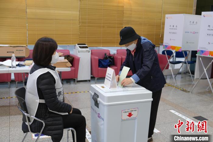 4月10日,韓國(guó)舉行第22屆國(guó)會(huì)議員選舉。圖為選民將選票投入票箱。中新社記者 劉旭 攝