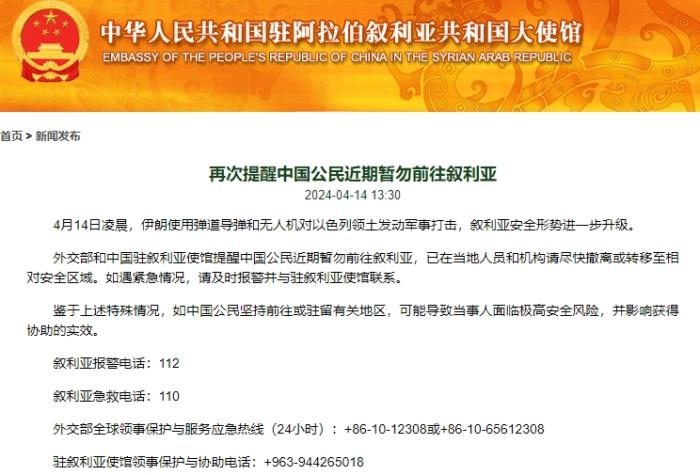 使館消息稱,4月14日凌晨,伊朗使用彈道導彈和無人機對以色列領(lǐng)土發(fā)動軍事打擊,敘利亞安全形勢進一步升級。