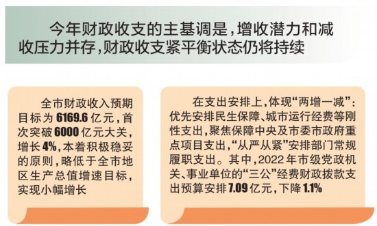 在財(cái)政收支依然嚴(yán)峻的情況下,“緊平衡”態(tài)勢也呈現(xiàn)出與以往財(cái)政收入零增長、負(fù)增長不同的態(tài)勢。吳素芳介紹,2022年的“緊平衡”,主要體現(xiàn)為收入回歸常態(tài)運(yùn)行,但各領(lǐng)域資金需求快速增長。財(cái)政部門要堅(jiān)決貫徹落實(shí)中央經(jīng)濟(jì)工作會(huì)提出的“積極的財(cái)政政策要提升效能,更加注重精準(zhǔn)、可持續(xù)”工作要求,通過調(diào)結(jié)構(gòu)、盤存量、抓統(tǒng)籌、保重點(diǎn)等方式做好保障。在支出安排上,體現(xiàn)“兩增一減”:優(yōu)先安排民生保障、城市運(yùn)行經(jīng)費(fèi)等剛性支出,聚焦保障中央及市委市政府重點(diǎn)項(xiàng)目支出,“從嚴(yán)從緊”安排部門常規(guī)履職支出。其中,2022年市級(jí)黨政機(jī)關(guān)、事業(yè)單位的“三公”經(jīng)費(fèi)財(cái)政撥款支出預(yù)算安排7.09億元,下降1.1%。