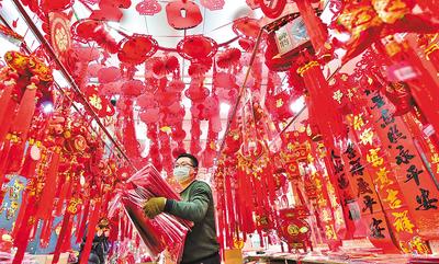 1月8日,石家莊市南三條市場(chǎng)的商戶在忙著準(zhǔn)備年貨。隨著農(nóng)歷新年的臨近,春聯(lián)、福字、燈籠、虎年生肖飾品的銷售行情逐日升溫。 河北日?qǐng)?bào)通訊員 張曉峰攝