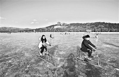 頤和園冰場(chǎng)的景色絕佳,冰場(chǎng)四周環(huán)繞著頤和園的亭臺(tái)樓閣,游客在冰面滑行的過程中,可切身感受到古人造園“步移景異”的精妙之處。冰上賞景的最佳選擇是騎行冰上自行車,冰上自行車幾乎對(duì)技術(shù)零要求,因?yàn)橛薪饘倏蚣艿闹危T行時(shí)比普通自行車還要平穩(wěn),冰上自行車可快可慢、可??烧?,游客呼吸著清冽的空氣,眼前則是高大雄偉的佛香閣與遼闊的西山群峰,盡管腳下在奮力地蹬車,在不知不覺間已融入到頤和園的山水畫卷之中。