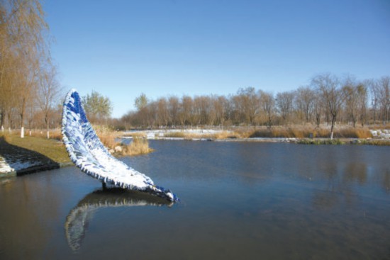 在通州區(qū)城市綠心森林公園的水系中,也有一件為冬奧會新創(chuàng)作的公共藝術作品《舟》。它看起來如同一葉代表“同舟共濟”的輕舟,也像一根羽毛、一片象征著和平與友誼的橄欖葉。走近仔細看,雕塑由許多鵝卵石般的陶瓷顆粒組成。它由中國藝術研究院雕塑家張冕、郅敏合作,是北京冬奧會公共藝術作品征集活動評選出的最佳作品之一。