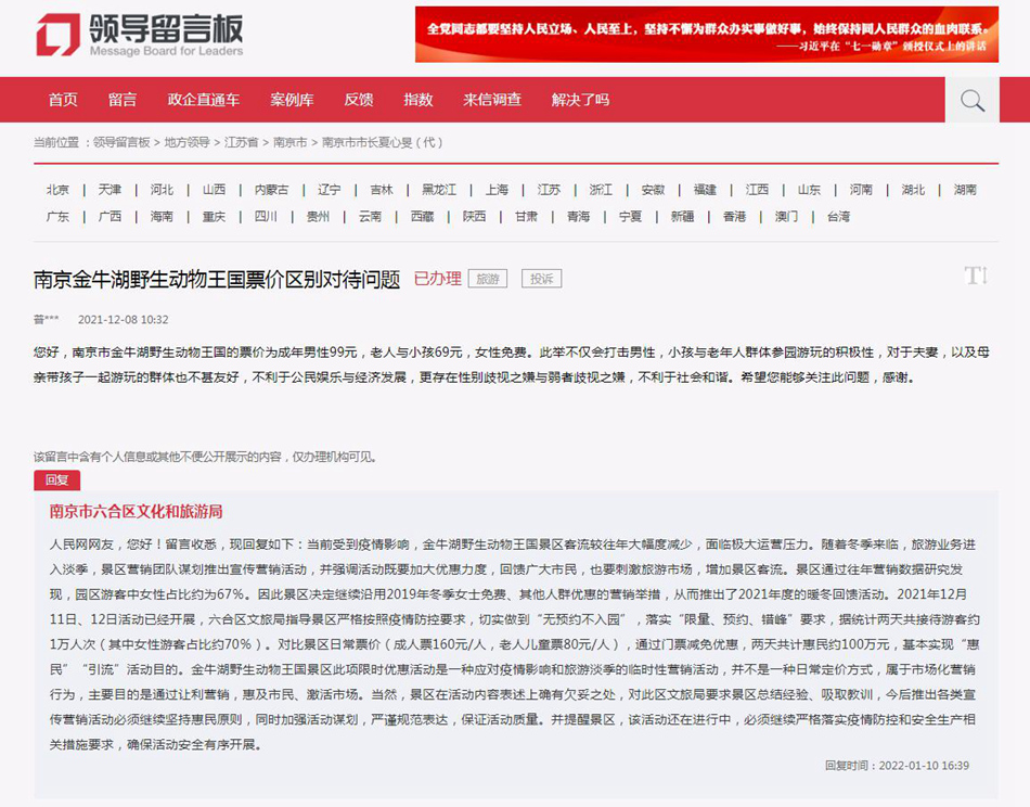 2021年12月8日,網(wǎng)友在人民網(wǎng)“領(lǐng)導(dǎo)留言板”向南京市市長(zhǎng)留言稱,南京市金牛湖野生動(dòng)物王國(guó)的票價(jià)為成年男性99元,老人與小孩69元,女性免費(fèi)。此舉不僅打擊男性、小孩與老年人參園游玩的積極性,而且對(duì)于夫妻以及母親帶孩子一起游玩的群體也不甚友好,不利于公民娛樂(lè)與經(jīng)濟(jì)發(fā)展,另外更存在性別歧視與弱者歧視之嫌,不利于社會(huì)和諧。