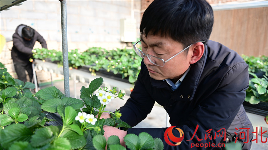 人民網(wǎng)保定1月17日電 17日,在保定市曲陽(yáng)縣晾甲山現(xiàn)代農(nóng)業(yè)園區(qū)草莓大棚內(nèi),園區(qū)負(fù)責(zé)人段少輝仔細(xì)查看草莓蜜蜂授粉及授粉后坐果情況。當(dāng)下,正值花期果期的曲陽(yáng)縣千畝保護(hù)地溫室大棚花香四溢,隨處可見熊蜂、蜜蜂授粉的忙碌身影。