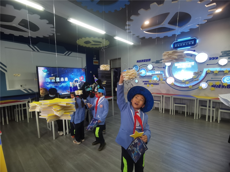 為進一步減輕學生的課業(yè)負擔,更好地促進學生們的全面發(fā)展,該校變“常規(guī)考試”為“學科素養(yǎng)考核”,學業(yè)評價借助“天宮之旅”項目式研學的形式進行,圍繞語文、數(shù)學、英語、體育、音樂、科學、美術七門學科,分一、二年級設置了“天宮生活艙”“探索星未來”“星球對對碰”“太空加油站”等“關卡”,學生們通過“闖關”既鞏固了知識,又提高了學習興趣。