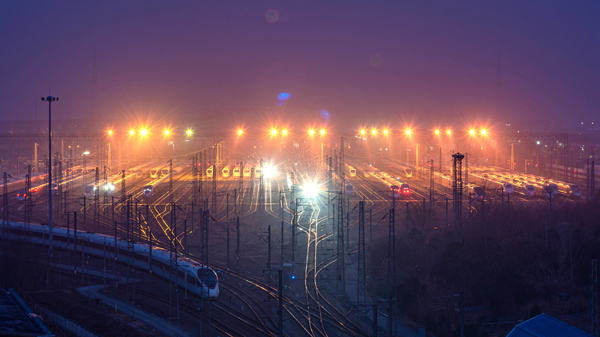 凌晨,一列動車組列車駛出上海虹橋動車運(yùn)用所。上海鐵路部門供圖