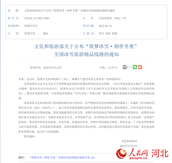 人民網(wǎng)石家莊1月19日電 (商帆)近日,文化和旅游部發(fā)布了“筑夢冰雪·相伴冬奧”全國冰雪旅游精品線路,10條線路涵蓋北京、河北、黑龍江、吉林、遼寧、新疆、內(nèi)蒙古7個北方冰雪旅游大?。▍^(qū)、市),以及甘肅、四川、湖北、重慶等近幾年冰雪旅游加快發(fā)展的地區(qū)。河北省“冰雪京張·冬奧之城”精品線路和“長城內(nèi)外·冰雪絲帶”精品線路入選。