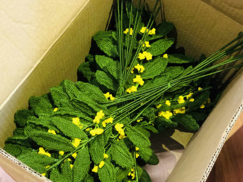 編織完成的絨線桂花成品被打包裝箱。親民社會工作服務中心供圖