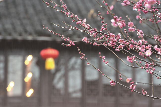 1月23日下午,嘉興市區(qū)梅灣街,冬雨中幾株紅梅迎春開(kāi)放,競(jìng)相爭(zhēng)艷。(徐志達(dá))