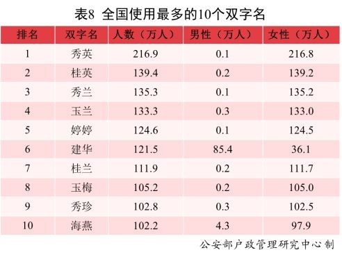 全國(guó)戶籍人口中,使用頻率最高的10個(gè)雙字名依次為:秀英、桂英、秀蘭、玉蘭、婷婷、建華、桂蘭、玉梅、秀珍、海燕。其中“秀英”名列榜首,使用人數(shù)為216.9萬(wàn)。