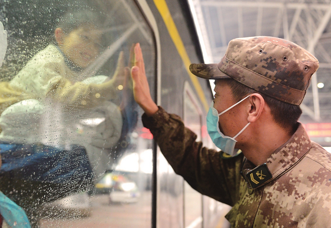 26日,隨著虎年春節(jié)臨近,南京火車(chē)站迎來(lái)春運(yùn)客流高峰。返鄉(xiāng)旅客懷著對(duì)“家”滿滿的愛(ài)踏上旅程。圖為一位解放軍戰(zhàn)士與返鄉(xiāng)的兒子隔著車(chē)窗玻璃把手掌疊在一起。本報(bào)記者 郎從柳 攝