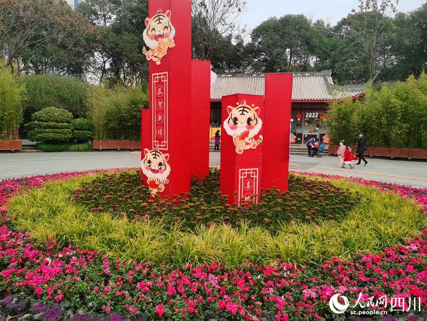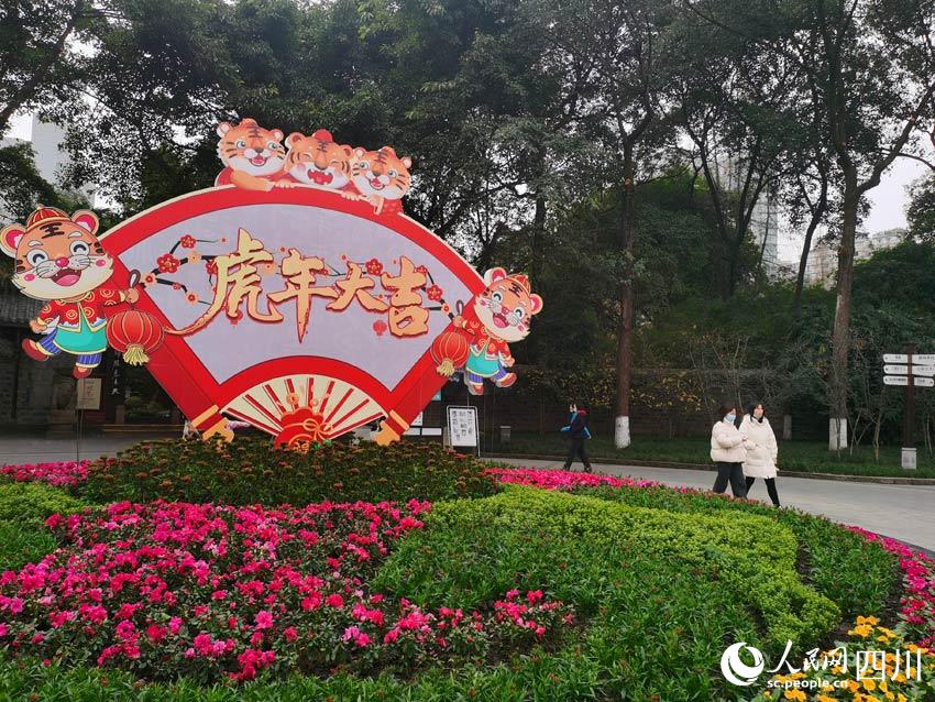 園內的幾處空地上,布置了幾個花壇。上邊除了吉祥的紅黃色彩,還有可愛的動漫形象老虎圖案?!盎⒛昙椤薄敖鸹⒂骸薄靶履昕鞓愤^年好”……各種好彩頭的詞語,標示出歡度春節(jié)的主題,看了讓人精神為之一振。