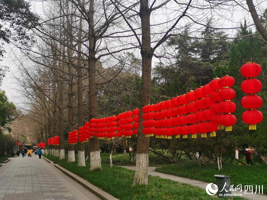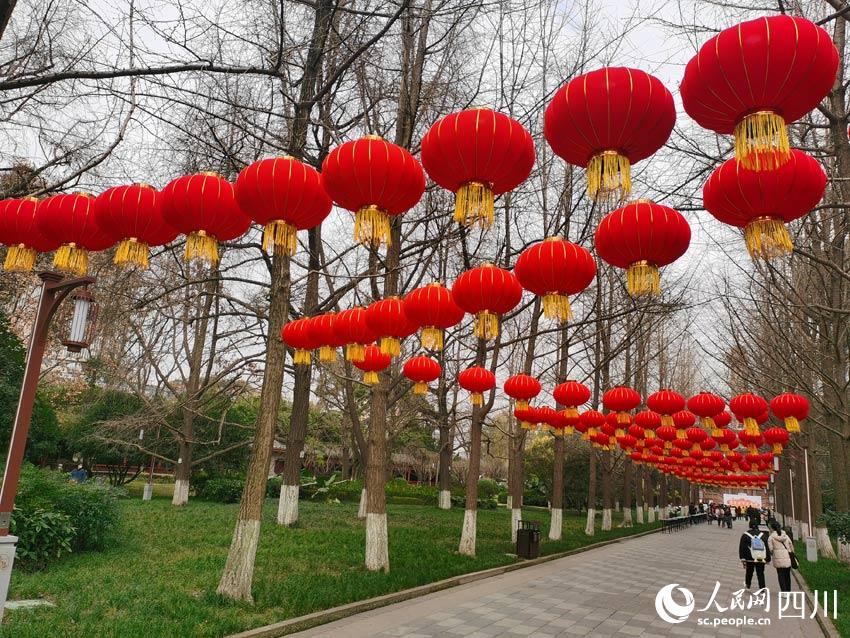 公園的大門布置成了喜慶的大紅色,門上門旁掛滿了紅燈籠。一串四個紅燈,既可以理解為“四季平安”,也可以理解為“四季發(fā)財”,還可以理解成“四平八穩(wěn)”……中國文化的詩意內涵,可以激發(fā)出人們更多的想象力。