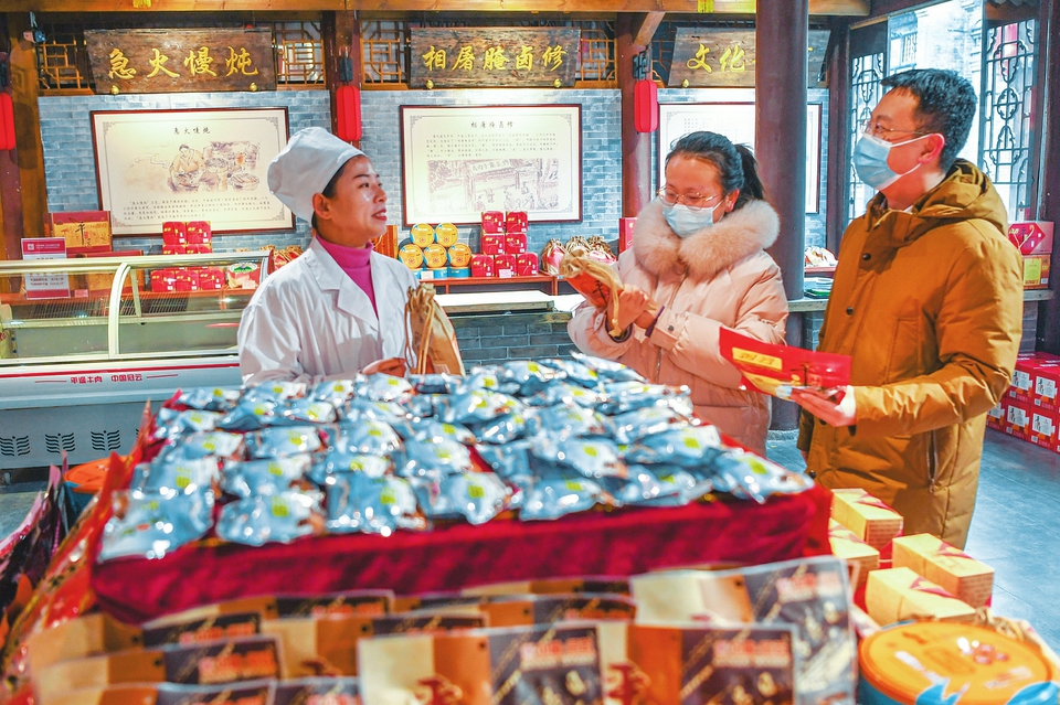 1月28日,游客在平遙古城一商店內購買年貨?;⒛甏汗?jié)將至,平遙古城內花燈高掛,特色產(chǎn)品商店貨物充足,洋溢著濃濃的年味。(梁生仁攝)