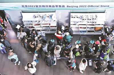 北京冬奧會正式開幕,冬奧周邊紀念品成了市民追捧的對象。2月5日,在國家體育館北京2022官方特許商品零售店前,前來觀看冰球比賽的觀眾排隊有序購買冬奧商品。北京青年報記者看到,商場工作人員在門口維護秩序,引導顧客限流間隔進入商店,并對一些熱銷商品倡導限量購買。