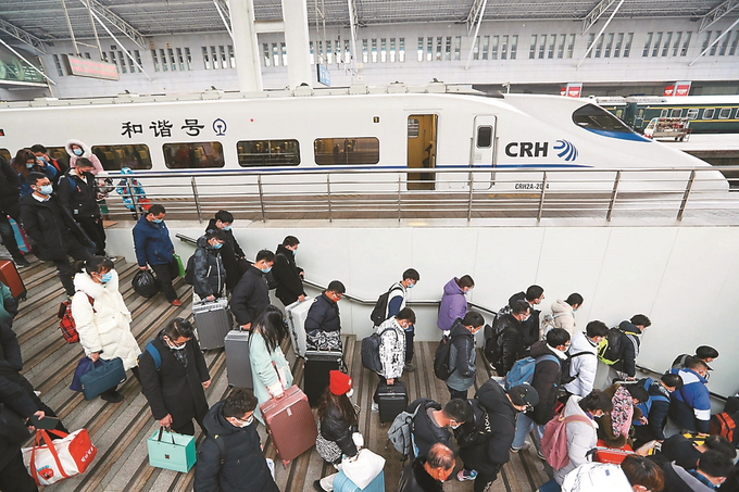 元宵節(jié)后,春運(yùn)迎來最后一波返程客流高峰。交通運(yùn)輸部門在切實(shí)保安全、保暢通、優(yōu)服務(wù)的同時(shí),加強(qiáng)執(zhí)法監(jiān)管,確保返程人員安全舒心出行。圖為17日,旅客在鐵路南京站有序出行。本報(bào)記者 陳儼 攝